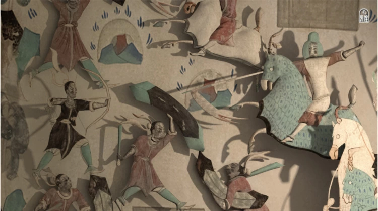 在敦敦的引领下,真实世界和虚拟世界相互交融,原来静态的壁画“活”了起来。激战时的短兵交接,一帧帧连环的画面开始在壁画上跳跃起来。随着战事的愈发激烈,兵器、马匹的影像细节被逐渐放大,背景音乐的鼓点声响起。
