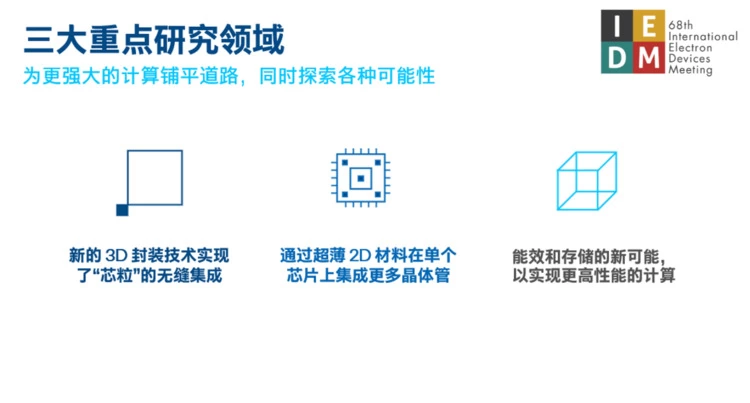 将互联密度再提升10倍的下一代3D封装技术,实现了准单片式芯片用于2D晶体管进一步微缩的新材料,包括仅三个原子厚的超薄材料能效和存储的新可能,以实现更高性能的计算