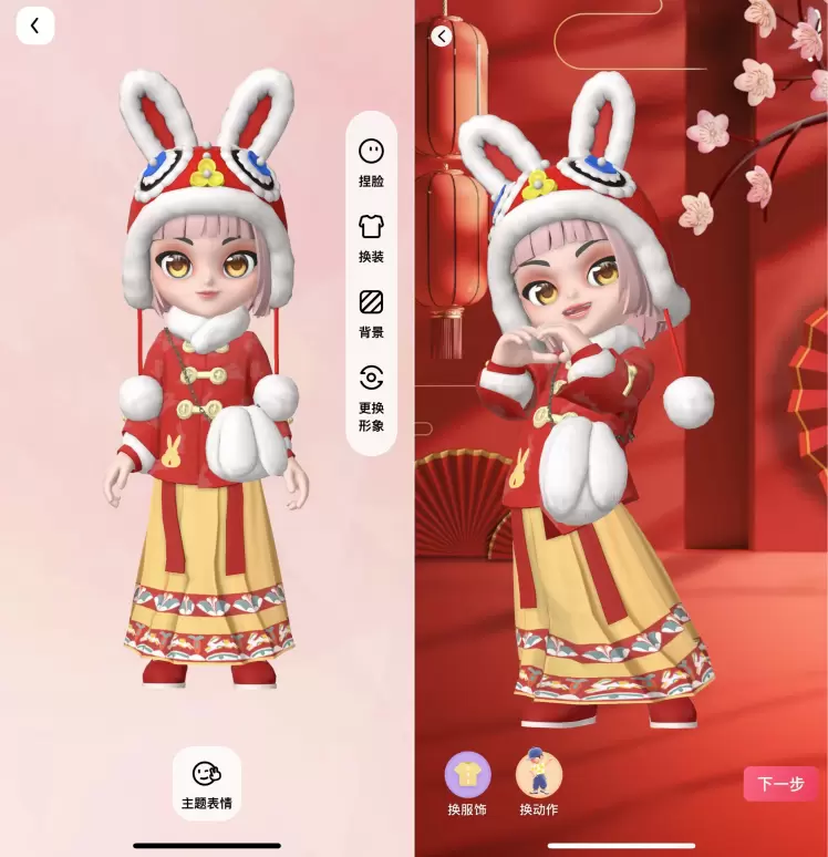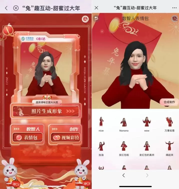 新年“兔”有趣,想在这个春节解锁让亲友眼前一亮的拜年方式?比特数智人视频彩铃拜年新玩法通通满足。登录中国移动APP,点击“数智人视频彩铃-拜年新玩法”展示横幅进入活动页面,或登录咪咕音乐APP活动页面,选择新春系列视频彩铃模板创作同款,每位用户都可以自由捏脸、换装,并随意搭配背景,定制自己专属的元宇宙比特分身。“拜年送福”、“兔年吉祥话”、“红包使不得”……模板涵盖轻松搞笑的趣味拜年段子、喜庆吉利的新年BGM、寓意好彩头的兔年吉祥话……从60后到00后,天南海北的网友、全家老小都可以找到适合自己的视频彩铃拜年新姿势。