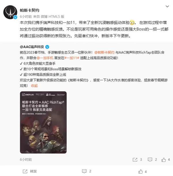 今天,AAC瑞声科技与《帕斯卡契约》官方宣布,将联合一加手机,为一加11独家适配高品质振动功能。