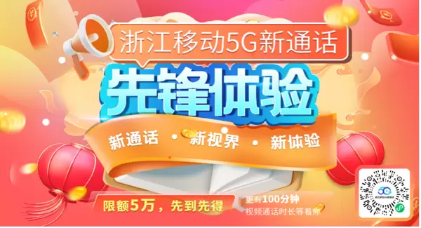 心动了吗?浙江移动为让更多用户尝鲜,本次活动共释放5万个“先锋体验用户”名额,不仅能限时免费体验5G新通话,还有100分钟视频通话时长等你领取!