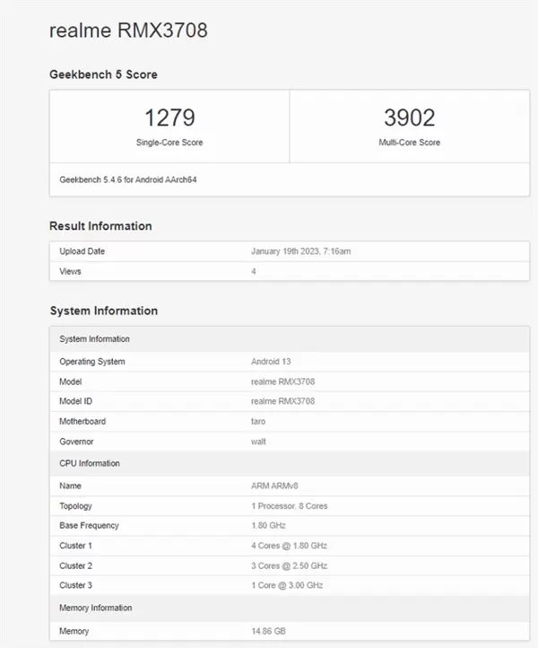 据信息显示,近日一款型号为RMX3708的realme机型现身了Geekbench跑分网站,预计就是真我GT Neo5,顶配版是16GB内存、1TB存储,这也是真我首款1TB手机。