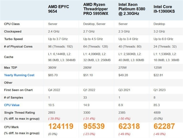 EPYC 9654比基于Zen3 Milan-X架构的64核EPYC 7773X更快。热那亚CPU得分为124K分,比Milan-X快36.8%。它的速度也是本月早些时候发布的Core i9-13900KS消费级CPU的两倍,具有24个内核和6 GHz最大时钟。