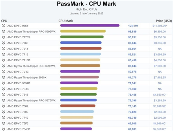 AMD EPYC 9654在高端CPU排名中,来源:PassMark