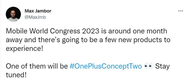 MWC将于2月27日在西班牙巴塞罗那举行,爆料人Max Jambor在社交平台透露,一加将会在MWC上发布第二款概念手机,命名为“OnePlus Concept Two”。
