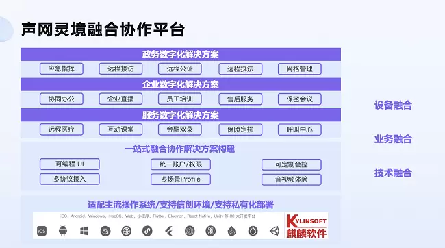基于这些行业痛点,声网在 2022 年推出了灵境融合协作平台,该套解决方案是基于声网原来在消费互联网领域的积累,并结合实时互动能力,面向企业数字化转型的一套解决方案,可支持设备融合、业务融合、技术融合三大特性。