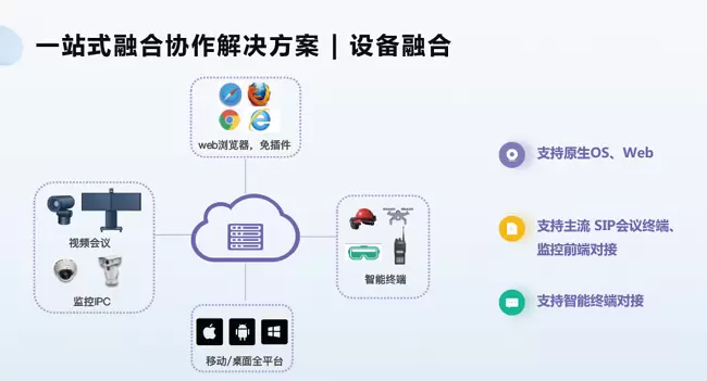 设备融合可以更好的解决旧设备的问题,确保客户在实时音视频接入的应用上能兼容视频会议、监控设备、无人机、AR眼镜异构智能终端设备等,并支持原生OS、Web,支持主流SIP会议终端、监控前端对接、智能终端对接等。