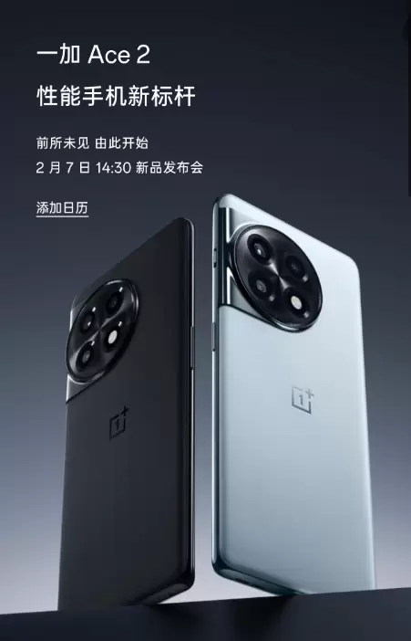 一加手机今日官宣,一加Ace 2将在2月7日14:30线上发布,宣称性能手机新标杆再现”。