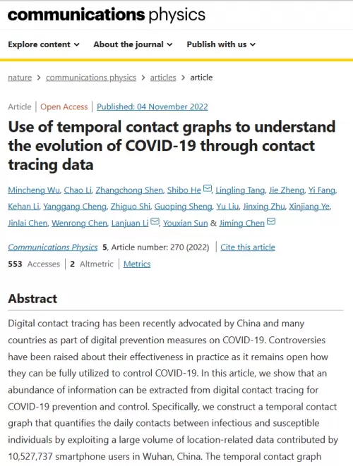近日,浙江大学陈积明课题组的论文"Use of temporal contact graphs to understand the evolution of COVID-19 through contact tracing data"(使用时间行为图谱结合行为数据的方式洞察新冠疫情演变)发表于《Nature》(自然杂志)子刊《Communications Physics》(通信物理学杂志)。每日互动创始人、CEO方毅及每日互动团队有幸在李兰娟院士、孙优贤院士及陈积明教授的指导下,深度参与本次课题研究。