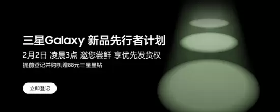 1月31日,三星官方宣布Galaxy新品先行者计划将于2月2日凌晨3点于三星商城、三星京东自营官方旗舰店、天猫三星官方旗舰店以及指定线下授权体验店等渠道正式开启,目前已经全面开放预约登记。届时,以三星商城为例,成功参与三星Galaxy新品先行者计划登记并抢先全款预约的用户有机会享2023年2月17日提前到店购机取货权益,并且还可获赠88元三星星钻。不仅如此,用户参与先行者活动并在指定期间内购买三星Galaxy S23系列手机,还有机会享有中国发布会后预约购机福利同等权益等惊喜礼遇。