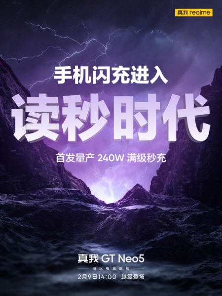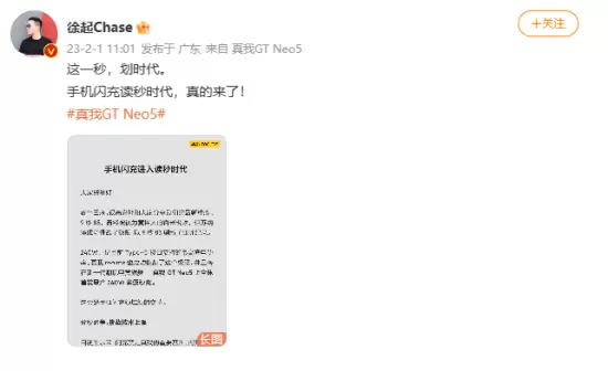 2月1日消息,realme开年大作真我GT Neo5即将登场,并将首发推出量产 240W满级秒充。今日,真我 realme 副总裁、全球营销总裁、中国区总裁徐起在社媒发布长文表示,手机闪充进入读秒时代。