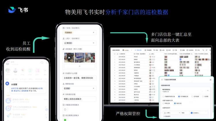给大家看两个例子,这两个例子背后是业务上不同的思考和作用。首先是我们的客户之一:物美。物美使用飞书的业务管理系统建设了千家门店的巡检系统,在物美的各个门店中,每天都发生着按照物美归纳的最优质的 SOP 所形成的工作流程。飞书帮助物美把这样的流程变成了工具,稍后我会和大家细讲这一工具形成的过程。