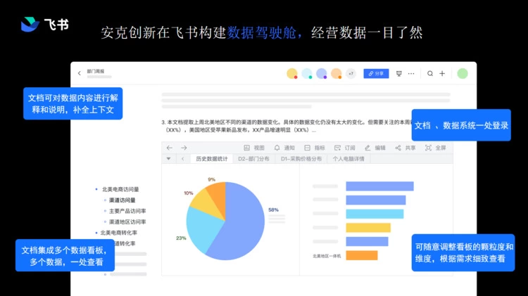 我们再看一下中国非常领先的消费电子公司:安克创新。这家公司不论在中国还是在国际上都有非常忠实的客户群,安克创新在飞书上构建了他们的“数据驾驶舱”。他们把经营数据导到飞书的业务系统里面,在业务系统里不同的人、不同的品类,比如做充电宝的、做音箱的、做耳机的,以及负责不同地区的不同管理者,都可以在“数据驾驶舱”中取到自己所需要的数据。这就是安克创新在飞书上管理业务的方式。