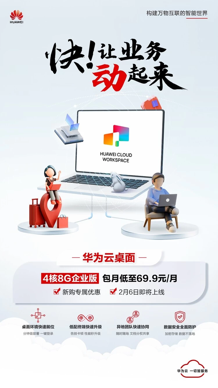 2月6日起,华为云桌面面向新用户开启限时特惠,4核8G版本包月仅需69.9元/月,进一步降低企业云上办公的成本。