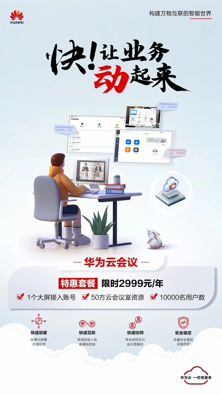 在华为云开工特惠活动期间,用户可免费下载使用云会议,获得50方云会议室资源,支持10000名用户数。同时,华为云会议面向新用户推出2999元特惠套餐,包括1个大屏接入账号、50方云会议室资源及10000名用户数,且单次会议不限时长,让企业无需付出过高成本即可尽享畅快高效的线上沟通。即日起套餐优惠持续至今年3月31日,需抓紧时间购买。