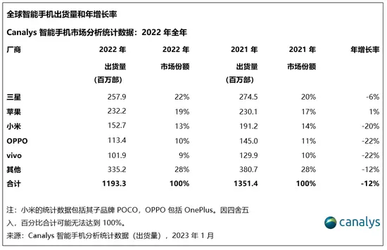 2月1日消息,市场研究机构Canalys发布的数据显示,由于需求疲软,2022年,各厂商的总出货量不足12亿部,导致全球年出货量下降12%。2022年前五大厂商分别为:三星、苹果、小米、OPPO、vivo。2022年第四季度全球智能手机出货量下降18%,跌至2.97亿部。
