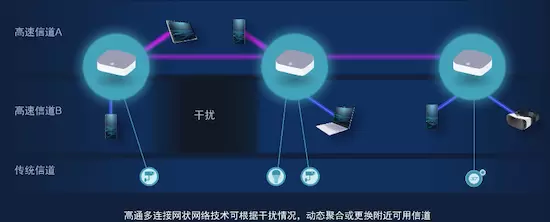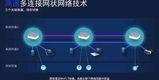 网状网络技术在Wi-Fi 7时代也得到了全新升级,高通Wi-Fi 7沉浸式家庭联网平台中所采用的高通多连接网状网络技术,专门面向三频Wi-Fi 7平台打造。其为一种全新的动态管理模式,可以使用2.4GHz、5GHz、6GHz三个频段,在其中动态选择不拥塞的频段,采取聚合或交替传输多个频段的策略,同时也不需要专门设定回传频段。这就意味着相比Wi-Fi 6的高干扰环境,Wi-Fi 7多连接网状网络的时延降低了75%,有效助力提升游戏体验。同时还能提升全屋千兆性能表现,相比Wi-Fi 6传统网状网络,在家中同一个位置,高通Wi-Fi 7多连接网状网络可以提升两倍的性能和两倍的吞吐量。