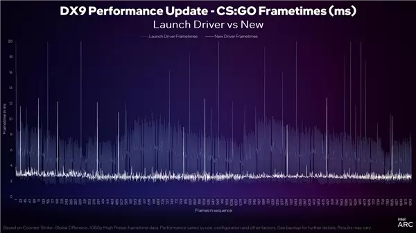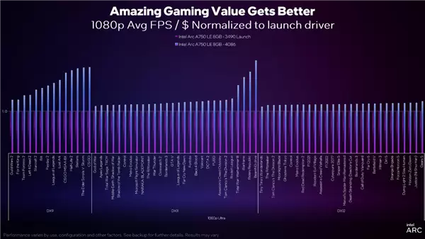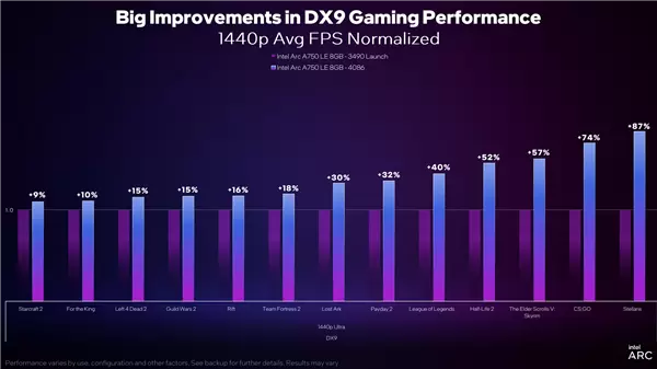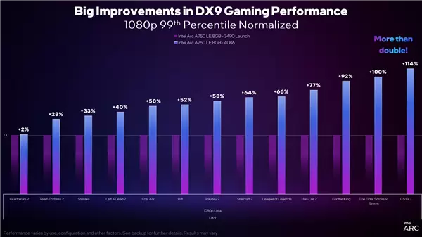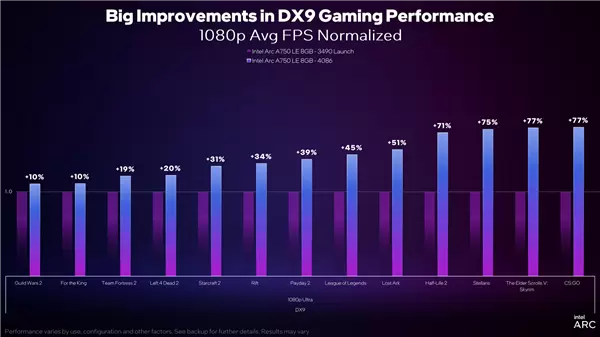 根据官方数据,Arc A750显卡搭配4086版新驱动,对比3490版首发驱动,DX9游戏帧率平均提升了多达43%。