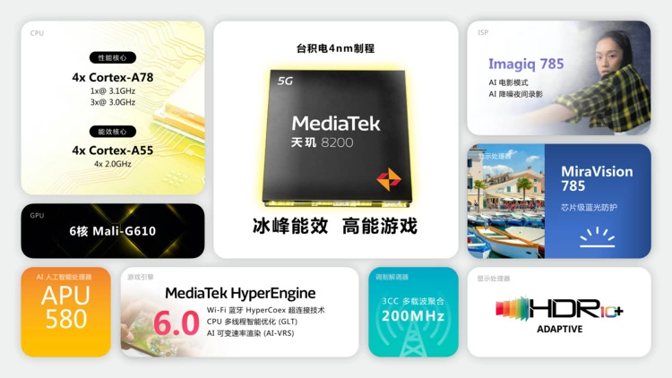 天玑8200则在延续高性能、高能效优势的基础上,进一步升级了影像、游戏等细分场景的用户体验。天玑8200采用先进的台积电4nm制程,八核CPU架构包含4个Cortex-A78大核,主频高达3.1GHz,搭载Mali-G610六核GPU,助力终端充分释放高性能、高能效优势。影像层面,天玑8200搭载强劲的Imagiq 785 ISP影像处理器和联发科第五代AI处理器APU 580,为高端手机提供出色的影像处理能力。同时,天玑8200还搭载了最新的MediaTek HyperEngine 6.0游戏引擎,支持多种旗舰级游戏技术,包括智能稳帧2.0、AI-VRS可变速率渲染、CPU多线程智能优化、5G快速通道等,可让高帧游戏更持久地满帧运行,减少游戏卡顿和延迟。
