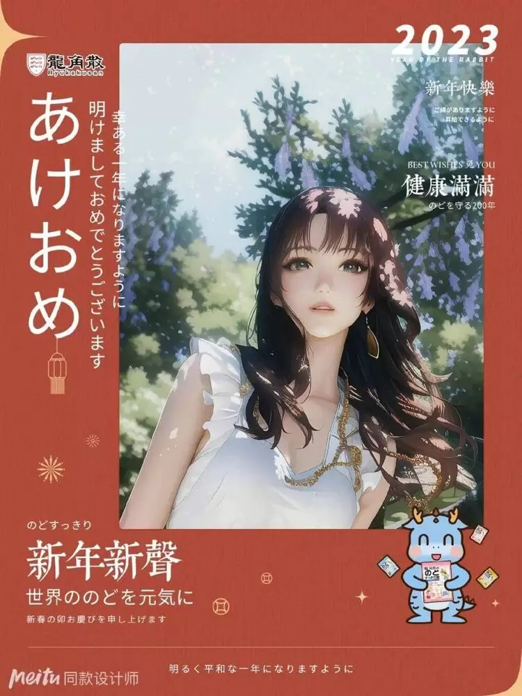 其中,春节大火的AI绘画在美图平台实现了首次商业化服务,让用户轻松实现AI变身。比如芯愿还圆官龙角散就将品牌元素融入美图平台原生科技,趣味AI效果+高人气模板上线即成爆款,为用户定制专属新愿大片,点燃健康新年味,成为人手必备的新年社交货币。龙角散也在此过程中软性植入品牌主张和产品卖点,实现精准消费人群转化的同时,延展品牌营销的高效触达和线性增长。