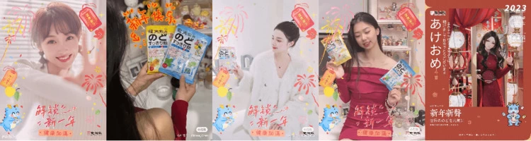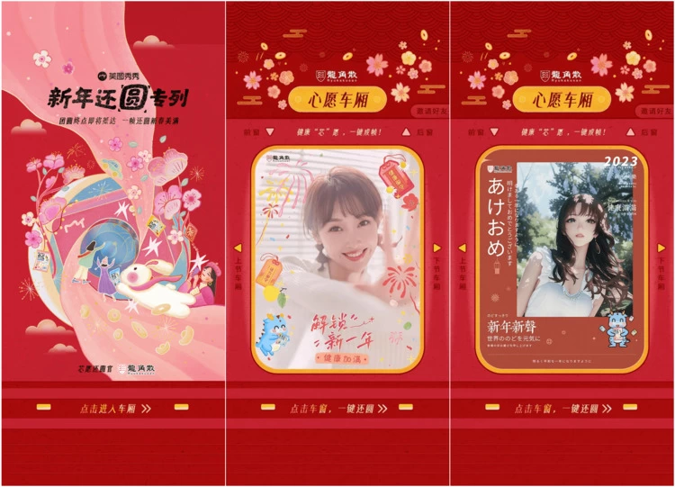 比如在新春还「圆」专列的每一节车厢,美图都提供了一种新年还圆玩法灵感,结合龙角散草本夹心糖的产品特性,设计了相应的影像贴纸,让用户在不同的场景之下户沉浸式感受过年圆满氛围。而「新年一帧还圆」的话题页,则将用户想要体验的节点氛围以更集中的方式,汇聚在一个可以交互的载体当中,而品牌内容则给予了新春体验一种全新的表达。
