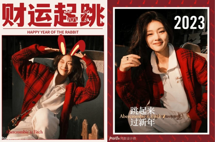 与此同时,美图平台还结合春节不同主题情感为品牌设计了春节限定配方,让用户沉浸在节日氛围中,也让品牌同时攻占多个场景空间。比如春节期间,美图平台分别在跨年、除夕两大节点为A&F定制了专属的新年大片,以此满足不同场景下用户的交互体验。高级感画框结合烟花、柔光滤镜,适配各类新年场景;兔耳等贴纸元素与融入品牌元素的祝福文字,烘托除夕年味的同时,也不失萌趣感。