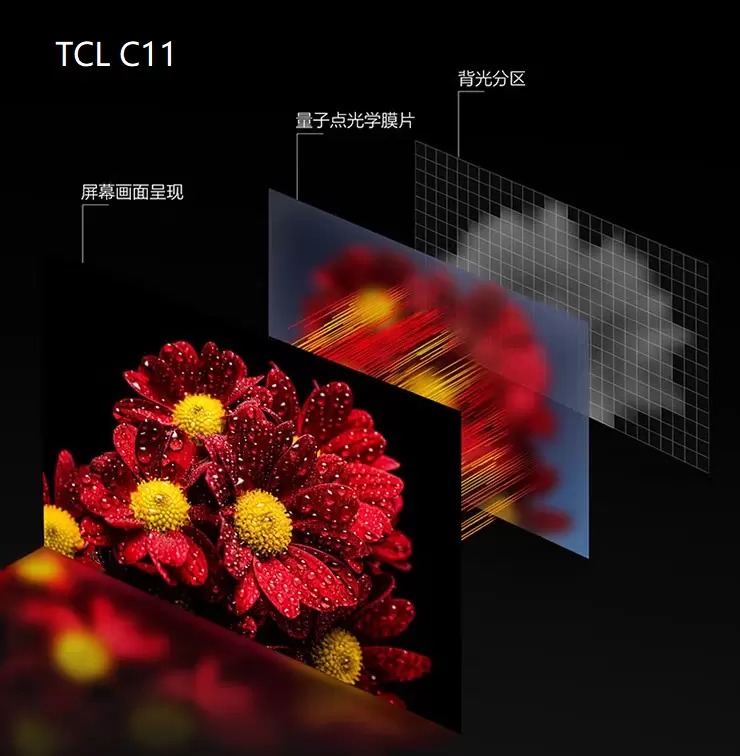 海报上显示即将发布的TCL C11G还会搭载全新的【量子点矩阵控光Pro】技术,让人十分好奇它会带来什么样的画质升级。回顾TCL C11搭载的量子点矩阵控光,它是将传统的面光源升级为由数百分区独立控制的矩阵式背光,实现精准控光,可以实现百级分区。