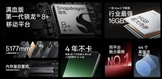 核心配置方面,一加 Ace 2 搭载满血版骁龙8+ 移动平台 + LPDDR5X + UFS3.1的组合,安兔兔跑分高达 1149494 分,刷新骁龙8+ 移动平台最高纪录。内存配置上,一加 Ace 2继续坚持“大内存普及”思路,12GB+256GB 起步,至高支持 16GB+512GB,性能释放领先一步。配合独家自研的内存基因重组技术,一加 Ace 2 重负载场景丢帧次数降低 50%,后台应用驻留最多达 44 个,后台驻留能力成为同平台第一。同时,一加 Ace 2 还获得南德 48 个月 A 级流畅认证及 SGS 人因流畅性 A+ 认证。