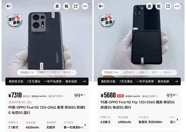 在价格上,转转官方验相比新品电商平台更具优势。12G+256G的99新OPPO Find N2在转转官方验上的售价为7318元,比新机价格低了600多元。同样内存配置的95新OPPO Find N2 Flip售价为5688元,也比新机便宜700多元。