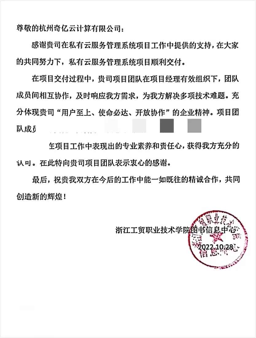 近期,浙江工贸职业技术学院就向360亿方云发来致谢信,对项目顺利交付表示感谢,并对双方未来的合作表达了由衷的期待。