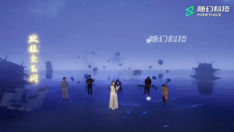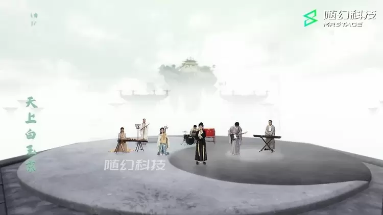 整场XR音乐会共由3个章节12个节目组成,随幻科技为《一念逍遥》量身打造了10大虚拟场景:演员在虚拟技术打造的缥缈仙雾和飞腾云霞中,穿梭在人界、灵界、仙界之间,沉浸式呈现了游戏中的三界世界观。并且,为了更加贴合游戏的水墨国风格调,虚拟空间场景中将游戏的2D元素与3D空间进行了完美融合,虚实变幻间,更显出了独特的国风XR内容魅力。