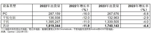 根据Gartner的最新预测,2023年全球设备(个人电脑 [PC]、平板电脑和手机)的总出货量将为17亿台,继2022年下降11.9%后再次下降4.4%。