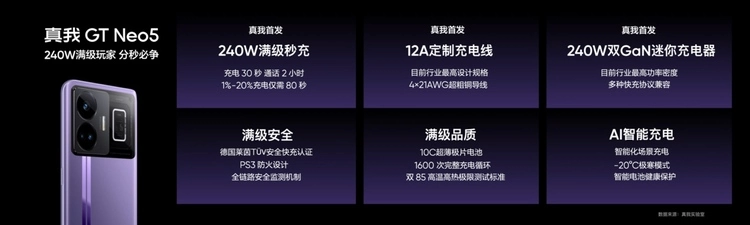真我GT Neo5是全球首个获得德国莱茵安全快充认证的240W高功率产品,也是行业首个超200W的长寿闪充方案、具有整机PS3防火设计、通过远高于行业标准的极限测试。真我不但追求用户体验的越级,更追求产品安全的越级。
