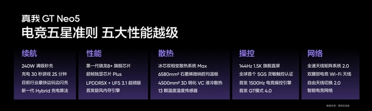 为打造更极致的游戏体验,真我realme联合中国泰尔实验室,在真我GT Neo5上实现行业首个基于手机电竞场景的性能测试标准——电竞五星准则,针对续航、性能、散热、操控、网络五大电竞体验维度,建立了科学的评价算法和标准。真我GT Neo5针对这五大维度,做了全面的升级和优化,带来该系列有史以来最大幅度的性能越级。