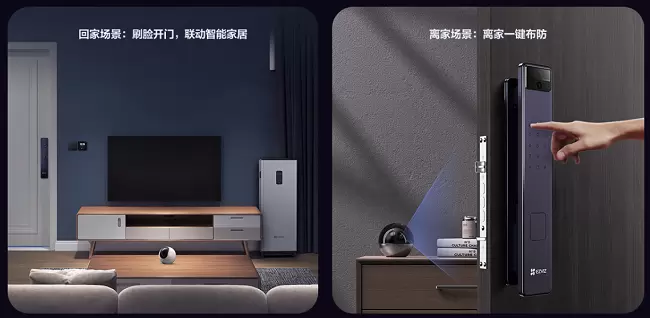 第二个趋势是智能门锁将融入全屋智能布局。主流品牌深耕智能家居市场,诸如萤石、华为、小米、海尔等企业不只是智能门锁单品布局,而是将其作为全屋智能建设的重要一环。以萤石网络为例,通过智联萤石云视频APP,用户可以设置回家、离家等场景模式,触发后,智能门锁将与家中的智能屏、智能灯光、智能窗帘、智能家居摄像机、告警传感器等单品联动。