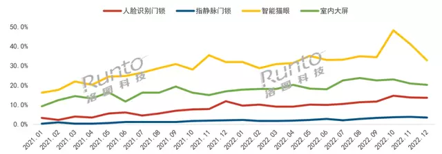 洛图科技(RUNTO)线上数据显示,2022 年,人脸识别门锁线上销量同比增长达 100%,市场份额从2021年1月的 3.2% 增至2022年12月的 13.5%;配备智能猫眼的智能门锁线上销量同比增长45%,市场份额从2021年1月的 16.2% 增至2022年12月的 32.8%;配备可视大屏的智能门锁线上销量同比增长为52%,市场份额从2021年1 月的 9.2%增至2022年12 月的20.2%。
