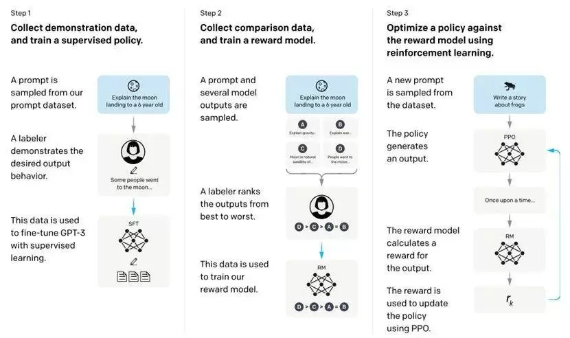 2、在完成监督指令微调后,就开始利用强化学习(模型在给定的环境中,不断地根据环境的惩罚和奖励,拟合到一个最适应环境的状态)对模型进行进一步的指令微调,具体地,首先在人类的帮助下训练一个奖赏网络,这个奖赏网络具有对多个聊天回复好坏进行排序的能力;