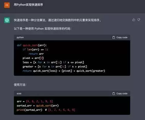 ChatGPT可以用于编写代码,如用Python实现快速排序。