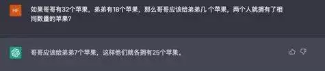 ChatGPT可以用于做数学题,如计算哥哥要给弟弟多少个苹果,才能使得哥俩的苹果数量相同。