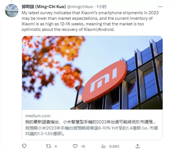 近日消息,天风国际分析师郭明錤发布的最新调查报告指出,小米智能手机的 2023 年出货量可能将低于市场预期,且目前小米库存高达 12–16 周,显示市场对小米 / Android 手机出货动能复苏仍过于乐观。