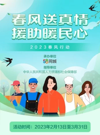 近日,人力资源社会保障部会同工信部、民政部、交通运输部等11部委在全国范围内开展主题为“春风送真情 援助暖民心”的2023年春风行动暨就业援助月专项服务活动。国民招聘大平台58同城积极响应政府号召,于2023年2月13日-3月31日,推出春风行动线上招聘会活动专场,为务工人员提供就业帮扶。
