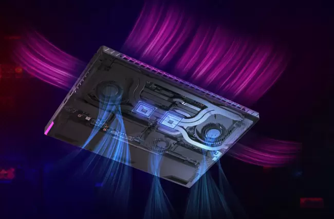 ROG枪神7 Plus超竞版在性能释放方面再度实现进阶。在手动模式下,枪神7 Plus超竞版的CPU+GPU可实现65+175W超高功耗释放。针对强悍的性能表现,ROG研发团队以全新升级的冰川散热架构3.0与之“强强配对”。CPU及GPU表面均覆盖了第二代Thermal Grizzly液态金属,超高的导热系数让导热效率远胜普通硅脂。备受好评的Arc Flow风扇升级至3枚,在增加气流速率的同时,让内部风道得到优化,散热效率再次进阶。7根热管与核心区域覆盖的414片0.1mm冰翼散热鳍片紧密结合,环绕式出风设计避免热量汇集,新加入的风扇防尘网则杜绝了细微碎屑造成的散热效率下降的问题。