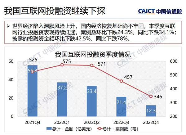 值得注意的是,2022年第四季度,我国互联网投融资12.3亿美元,投融资规模继续下探,案例数环比下跌24.3%,同比下跌34.1%;披露的投融资金额环比下跌42.5%,同比下跌78%。