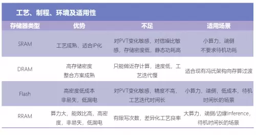 目前可用于存算一体的成熟存储器有NOR FLASH、SRAM、DRAM、RRAM、MRAM等。相比之下,RRAM具备低功耗、高计算精度、高能效比和制造兼容CMOS工艺等优势: