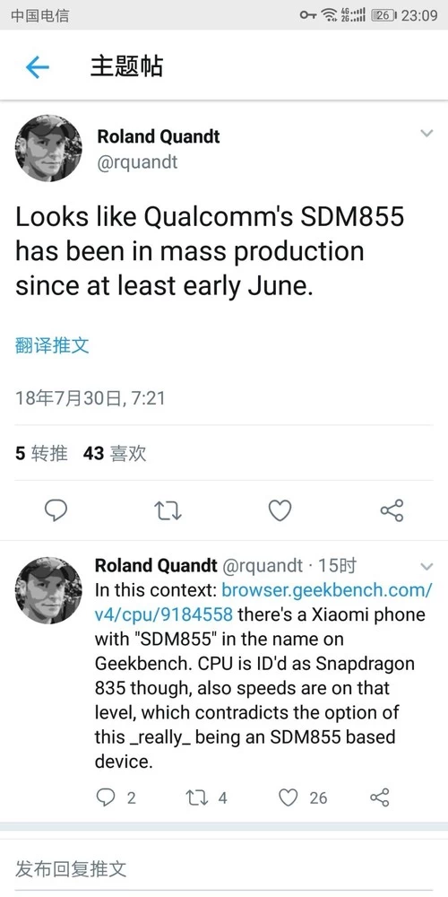 据Twitter爆料大神Roland Quandt透露,全新的高通骁龙855处理器似乎在6月初已经开始大规模量产,这意味着骁龙855处理器已经完成了设计和流片,将很快提供给手机厂商进行测试。同样采用7nm制造工艺的苹果A12仿生芯片、华为麒麟980等顶级芯片是骁龙855最主要的对手。