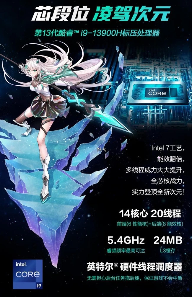 性能方面,天选4 Plus迎来实力进阶。13代英特尔酷睿i9-13900H处理器,采用英特尔7制程工艺,具有14核心20线程规格,内置24MB高速缓存,最高睿频可达5.4GHz,不仅任务多开无压力,而且能轻松满足大型网游的运算需求。同时配备NVIDIA GeForce RTX 4070笔记本电脑GPU,140W满功耗释放,支持双显三模显卡热切换与TX Boost技术,增强模式下可自动超频,畅享顶级3A画质。此外,由双Arc Flow绝尘风扇、五热管、四出风口组成的冰川散热系统可助性能释放更加稳定。