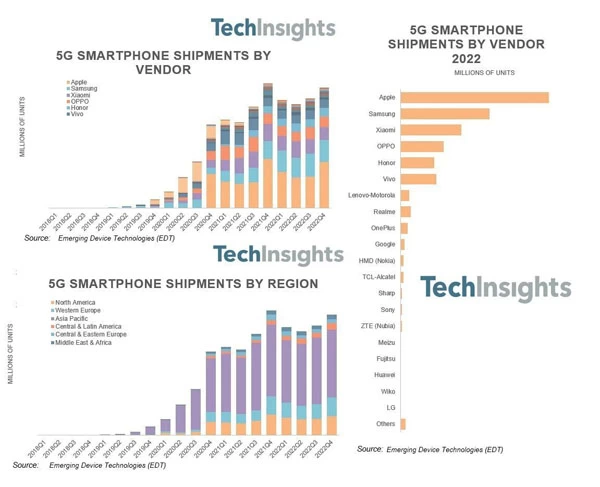 2月14日消息,据Strategy Analytics数据显示,2022年5G智能手机出货量接近7亿。5G继续增长,但增长率将停滞不前,因为5G已经成为高端智能手机中事实上的蜂窝技术。苹果仍然是领先的5G设备厂商,而三星则是全球增长最快的主要厂商,并且正在追赶苹果。