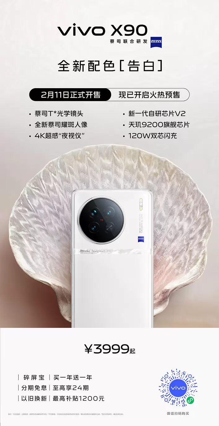秉持“至简至真”设计理念的vivoX90全新配色“告白”,并非是纯白色系,它以更接近珍珠般的光泽和白母贝的温暖色调,从内而外透着洁白无暇和温润如玉。因此,用“珍珠白”形容X90告白更为恰当,且非常符合X系列一直以来“纯粹且高级”的色彩风格。