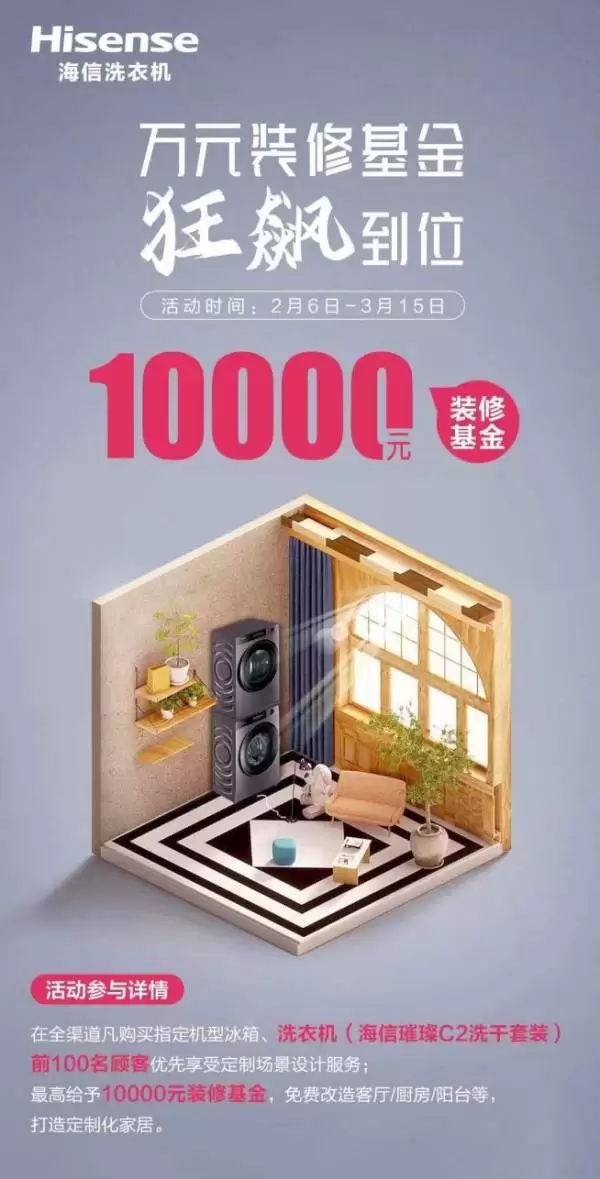 据了解,从即日起至3月15日,只要购海信洗衣机璀璨C2洗干护理套装及其他指定机型的前100名顾客,就可优先享受定制场景设计服务,并最高给予10000元装修基金,免费改造阳台、厨房、客厅等空间,为家升级焕新,让家更美好。