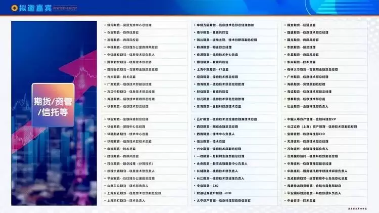 为助力行业信息化决策者打开多重困局,实现行业高质量发展,FCS 2023 第五届中国证券基金与资管数字科技峰会将于2023年3月28日-29日在上海举办。本届峰会以“2023:数据洞察 数智运营”为主题,力邀350+来自证券、基金、期货、信托、租赁、资产管理等金融行业信息技术、信息安全、风险管理等相关部门的高层领导及负责人,以及优秀信息化解决方案供应商,一同解码金融行业关键数字抓手,全面发力行业科技转型,激发数据要素创新活力,擘画金融科技未来增长蓝图。